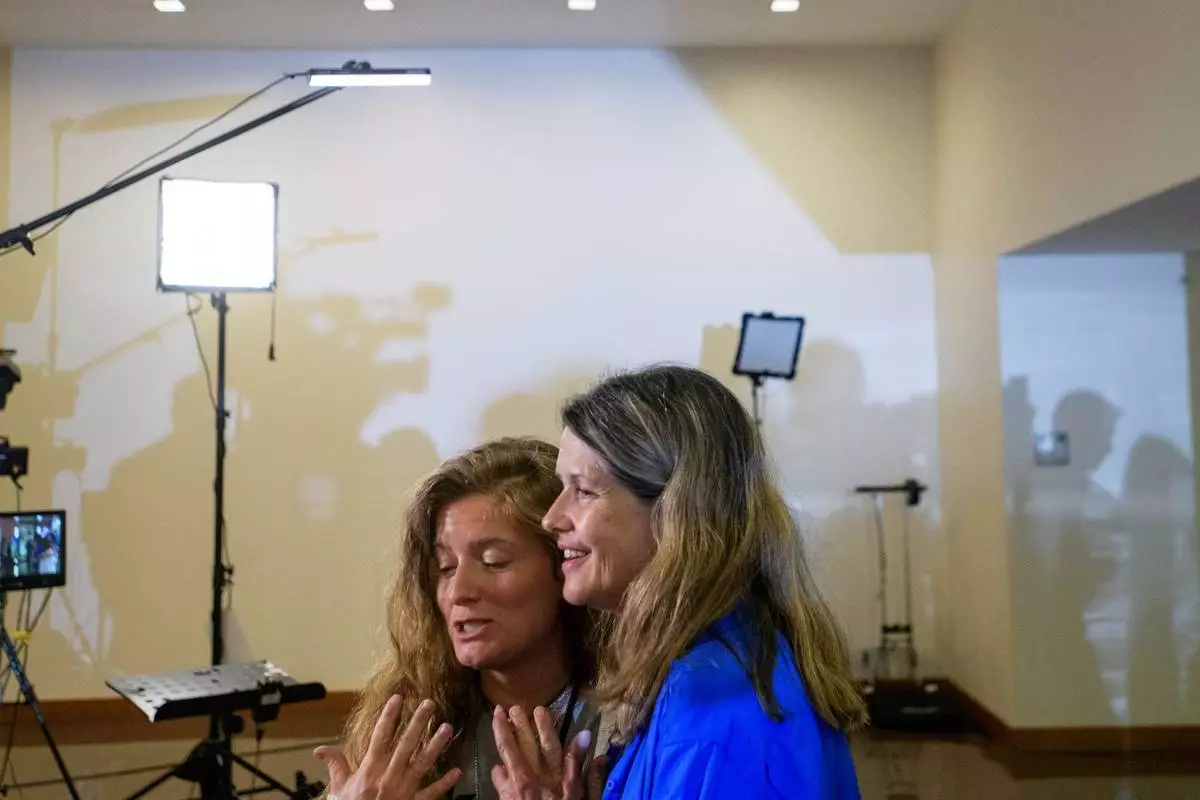 Ashleigh Stovall, left, is joined by her mother in-law Christina Stovall, right, as she talks about her husband, Mikey Stovall, who perished on American Airlines flight 5342 in a collision with a U.S. military helicopter, during the NTSB fact-finding hearing on the DCA midair collision accident, at the National Transportation and Safety Board boardroom, Wednesday, July 30, 2025, in Washington. (AP Photo/Rod Lamkey, Jr.)