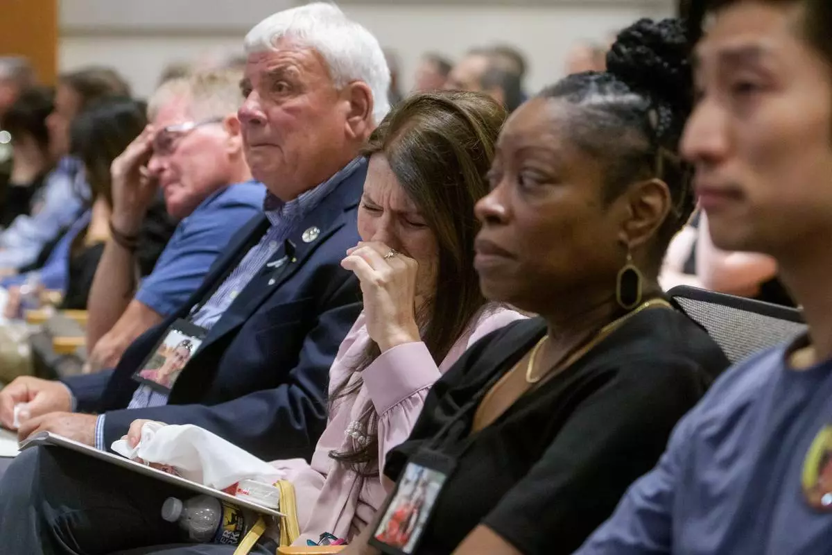 Family members of the victims of American Airlines flight 5342 who perished in a collision with a U.S. military helicopter, listen to opening statements during the NTSB fact-finding hearing on the DCA midair collision accident, at the National Transportation and Safety Board boardroom, Wednesday, July 30, 2025, in Washington. (AP Photo/Rod Lamkey, Jr.)