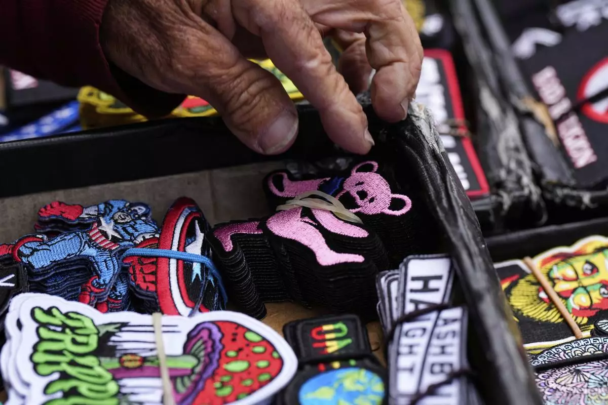 A merchant picks up a Grateful Dead patch out his inventory for a customer in San Francisco, Saturday, July 19, 2025. (AP Photo/Godofredo A. Vásquez)