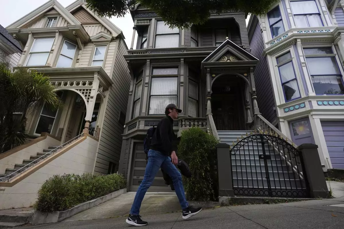 A man walks past the house where the original members of the Grateful Dead music group lived in San Francisco, Saturday, July 19, 2025. (AP Photo/Godofredo A. Vasquez)