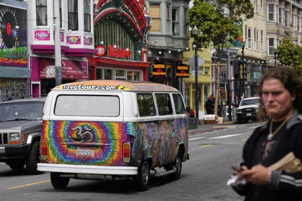 A tour van featuring a painting of musician Jerry Garcia travels through Haight Street in San Francisco, Saturday, July 19, 2025. (AP Photo/Godofredo A. Vasquez)