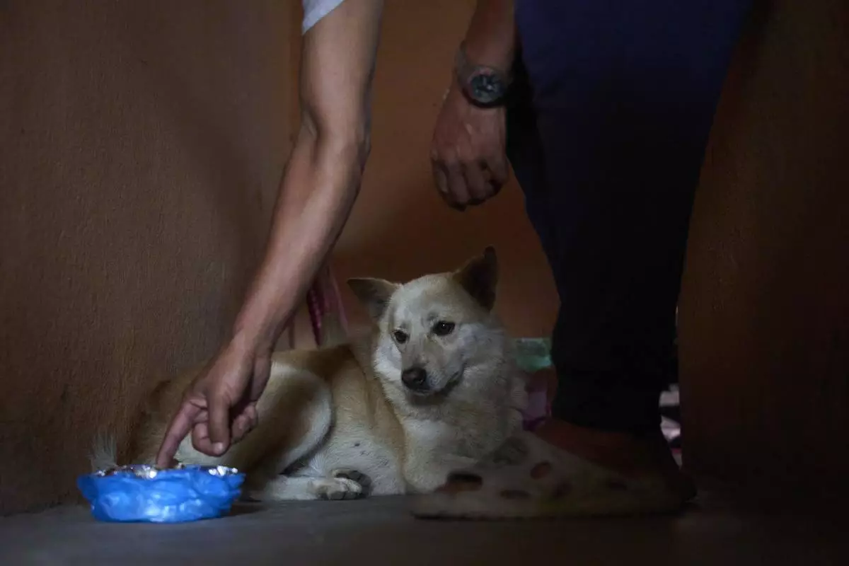 Babu Tamang gently encourages his dog Shayam to eat in their rented house in Kathmandu, Nepal, Thursday, July 24, 2025. (AP Photo/Niranjan Shrestha)