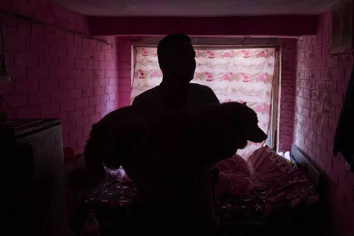 Babu Tamang carries his dog Shayam while playing in their small rented house in Kathmandu, Nepal, Thursday, July 24, 2025. (AP Photo/Niranjan Shrestha)