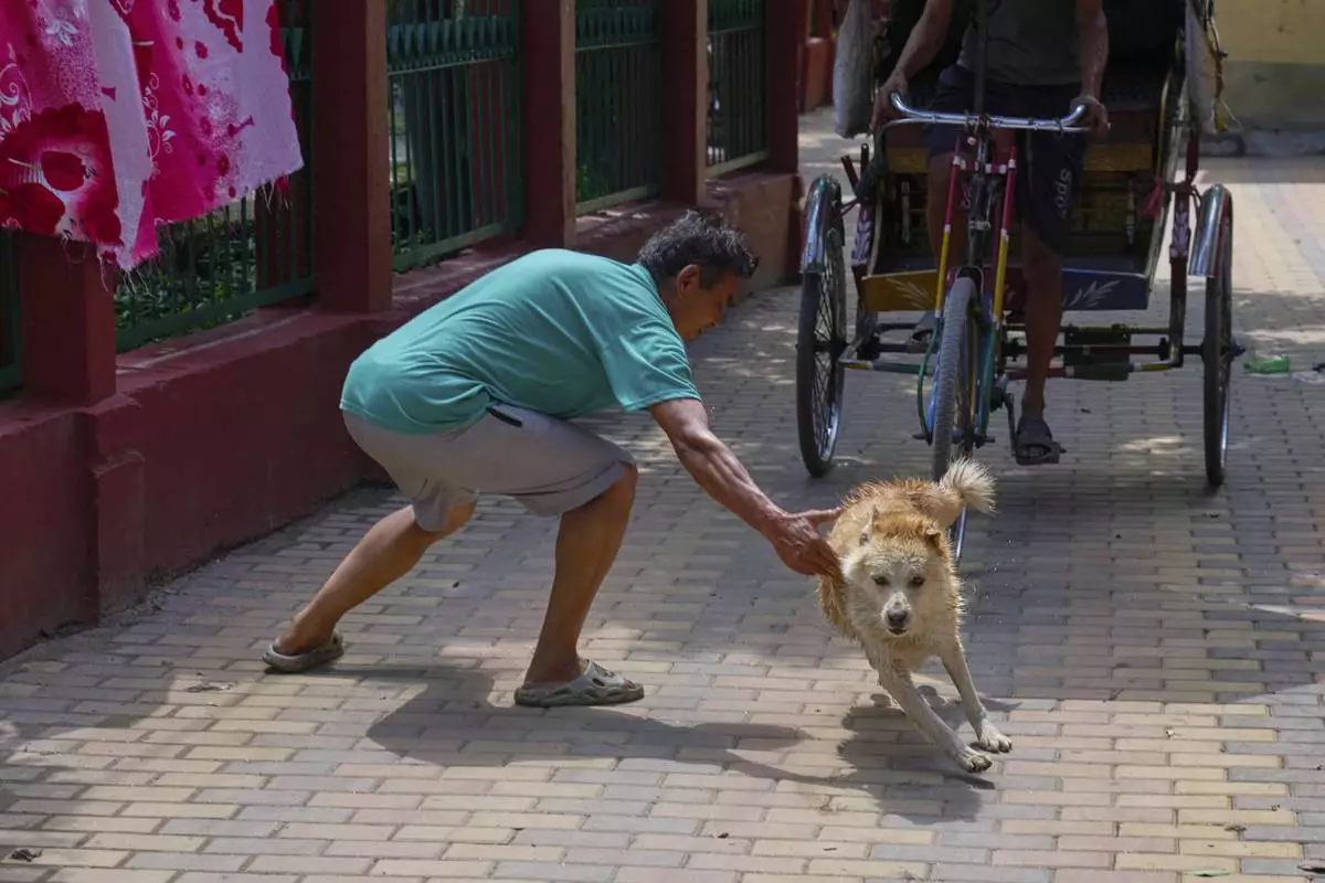 Babu Tamang tries to catch his canine Shayam to give him a bath in Kathmandu, Nepal, Sunday, July 13, 2025. (AP Photo/Niranjan Shrestha)