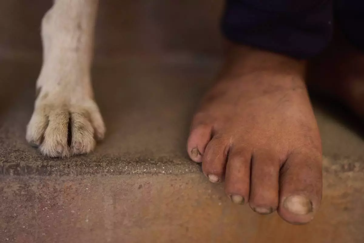 The feet of Babu Tamang and his dog Shyam are seen as they both take a nap before heading out to work in their small rented house in Kathmandu, Nepal, Thursday, July 24, 2025. (AP Photo/Niranjan Shrestha)