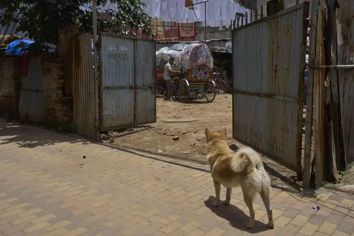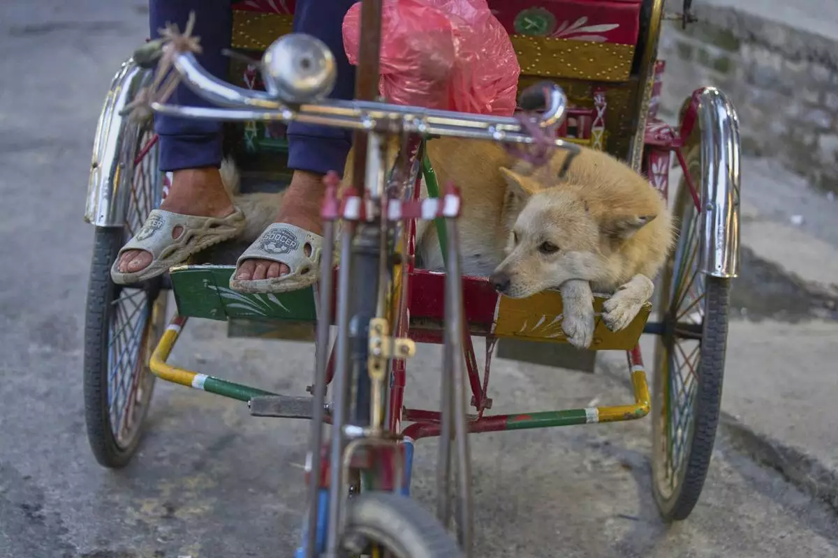 Babu Tamang and his dog Shayam wait for passengers in Thamel, a tourist hub in Kathmandu, Nepal, Wednesday, July 2, 2025. (AP Photo/Niranjan Shrestha)