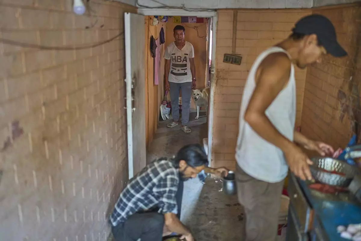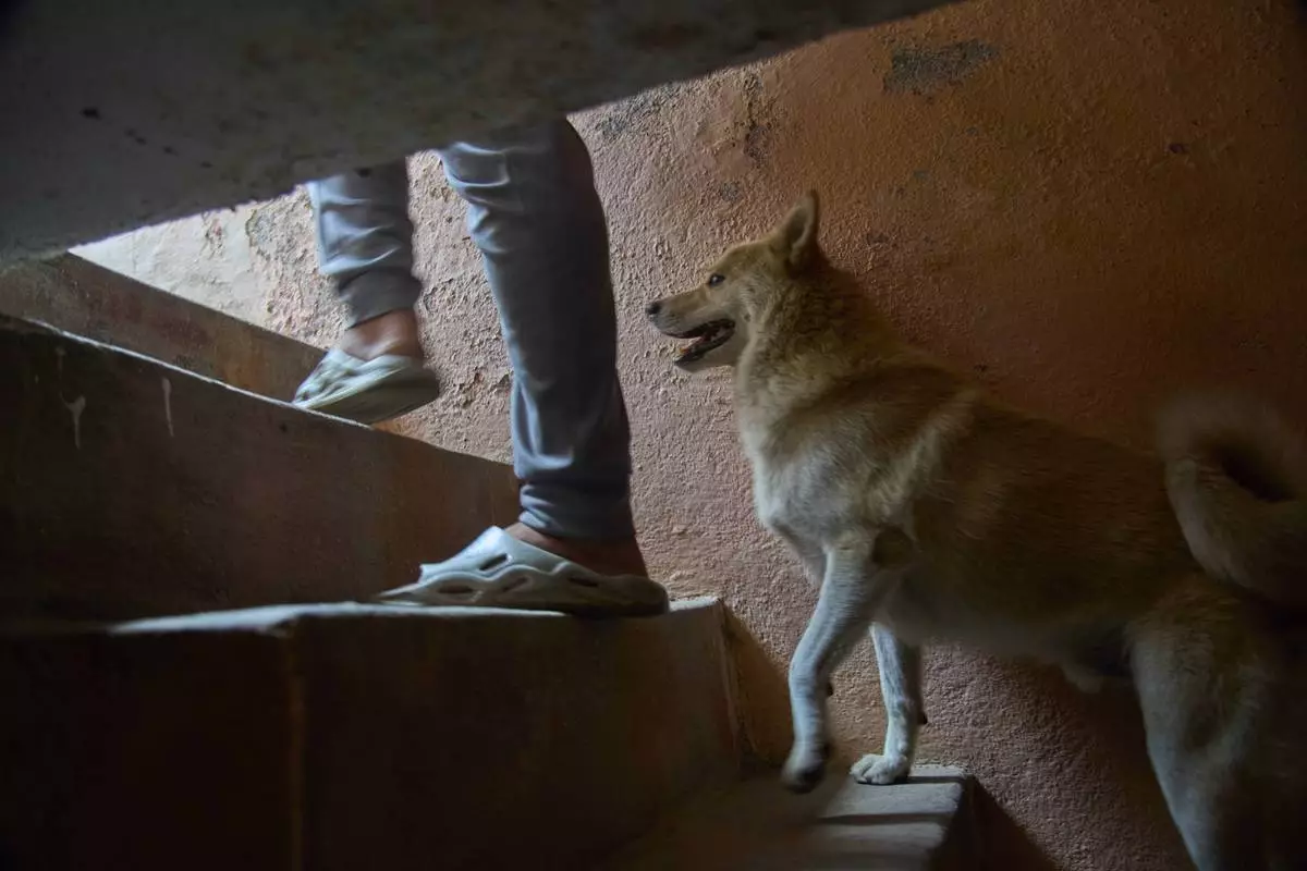 Babu Tamang arrives with his canine Shayam as his apartment mates prepare lunch in their small rented house in Kathmandu, Nepal, Thursday, July 3, 2025. (AP Photo/Niranjan Shrestha)