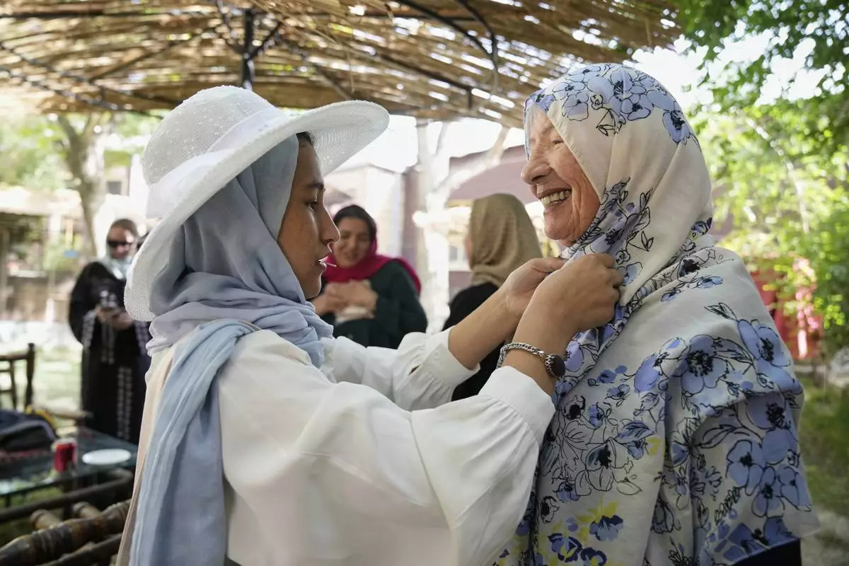 Maryam, a young Afghan on her first day of training to become a tour guide, helps 82-year-old Australian tourist Suzanne Sandral adjust her hijab in Kabul, Afghanistan, Wednesday, May 28, 2025. (AP Photo/Ebrahim Noroozi)