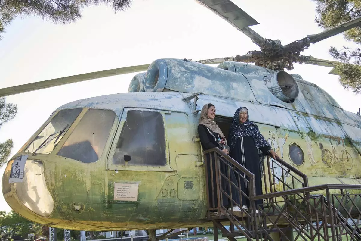 Afghan tour guide Somaya Moniry, 24, left, and 82-year-old Australian tourist Suzanne Sandral pose for a photo next to a military helicopter during a visit to the War Museum in Kabul, Afghanistan, Wednesday, May 28, 2025. (AP Photo/Ebrahim Noroozi)