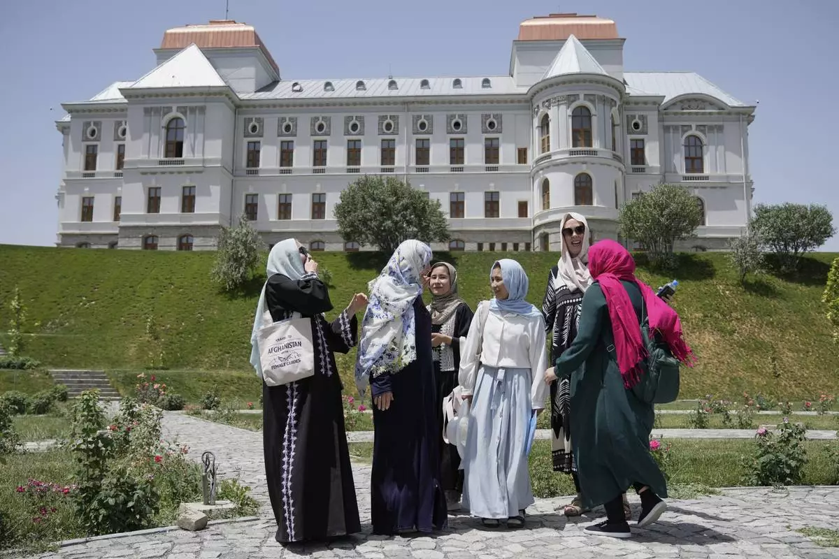 Zoe Stephens, 31, from Britain, takes a selfie with other foreign, female tourists and Maryam, a local trainee tour guide, at left, at Darul Aman Palace in Kabul, Afghanistan, Wednesday, May 28, 2025. (AP Photo/Ebrahim Noroozi)