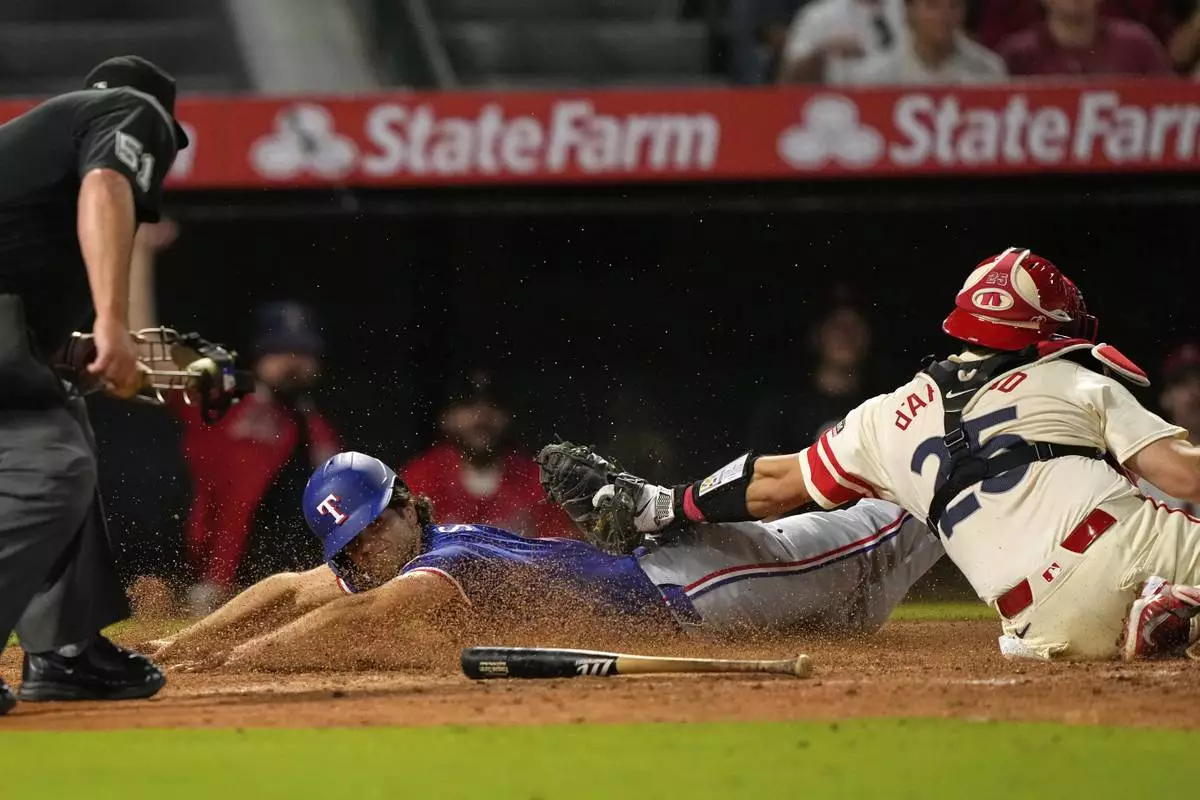 Texas Rangers' Josh Smith, center, scores on a single by Ezequiel Duran as Los Angeles Angels catcher Travis d'Arnaud puts a late tag on him during the sixth inning of a baseball game Tuesday, July 29, 2025, in Anaheim, Calif. (AP Photo/Mark J. Terrill)