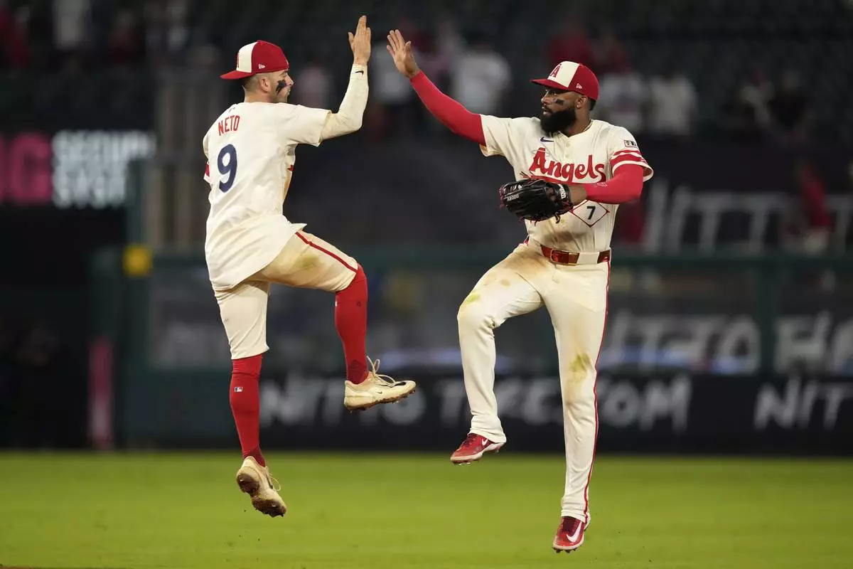 Los Angeles Angels' Zach Neto, left, and center fielder Jo Adell celebrate after the Angels defeated the Texas Rangers 8-5 in a baseball game Tuesday, July 29, 2025, in Anaheim, Calif. (AP Photo/Mark J. Terrill)