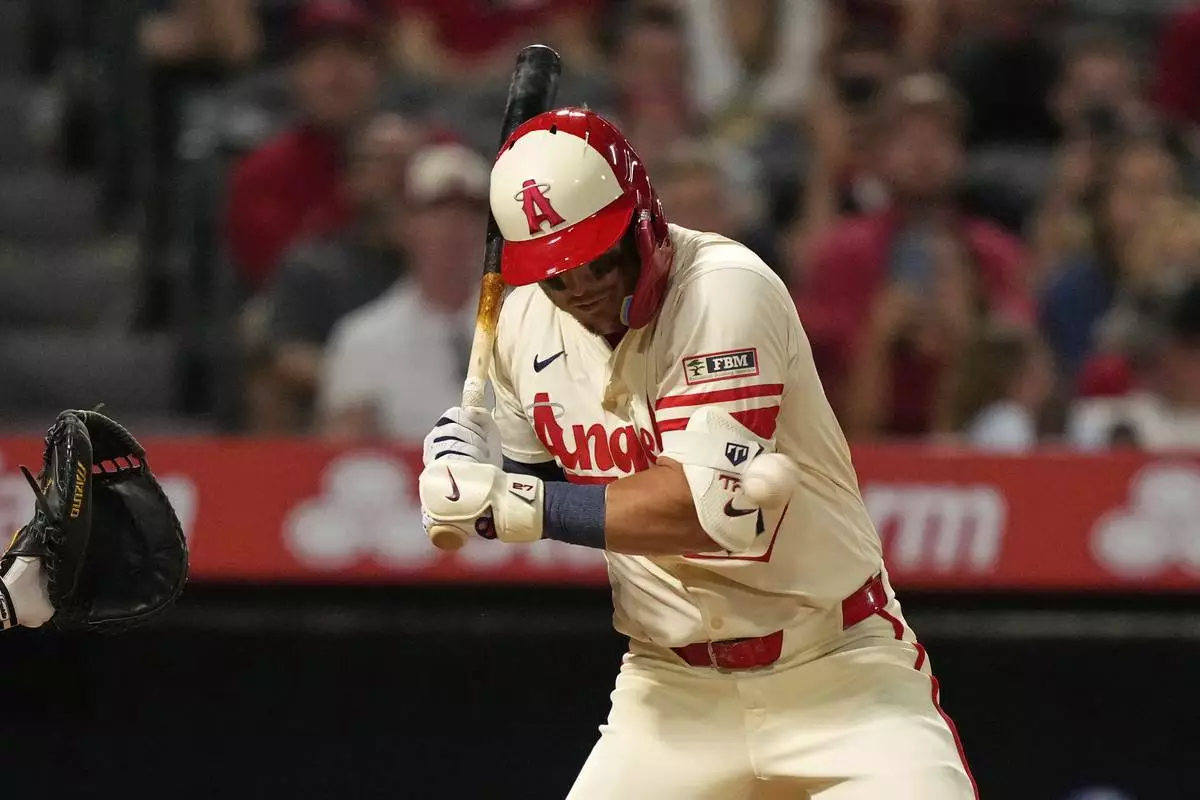 Los Angeles Angels' Mike Trout is hit by a pitch during the eighth inning of a baseball game against the Texas Rangers, Tuesday, July 29, 2025, in Anaheim, Calif. (AP Photo/Mark J. Terrill)