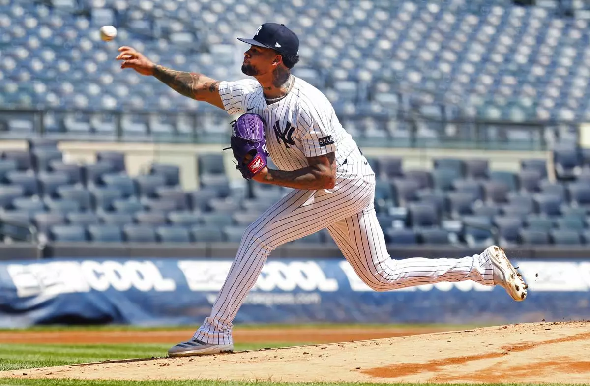 FILE -New York Yankees' Luis Gil throws during live batting practice before a baseball game between the New York Yankees and the Baltimore Orioles, June 21, 2025, in New York. (AP Photo/Noah K. Murray, File)