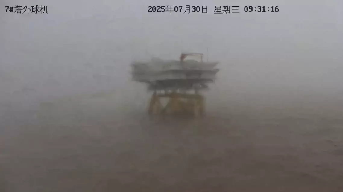 Footage taken by industrial monitoring cameras at the Huaneng No. 2 offshore wind power project off the coast of Zhejiang's Jiaxing City, shows turbulent waves and persistent rain lashing against the cameras under a darkened sky.