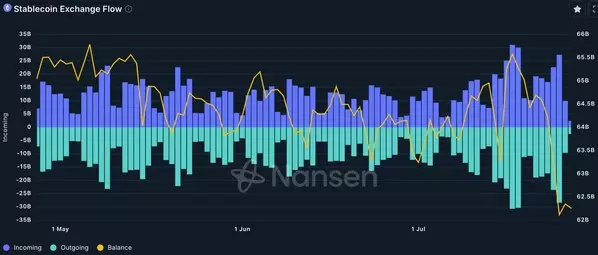 - Stablecoin balances across exchanges trending down: Major cryptocurrency exchanges are recording decreasing levels of stablecoin reserves, collectively at a 3-month low. This is interpreted as risk-on sentiment as investors were deploying funds and entering active trading mode.