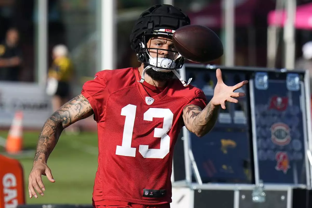 Tampa Bay Buccaneers wide receiver Mike Evans (13) makes a catch during practice at the team’s NFL football training camp, Friday, July 25, 2025, in Tampa, Fla. (AP Photo/Chris O'Meara)