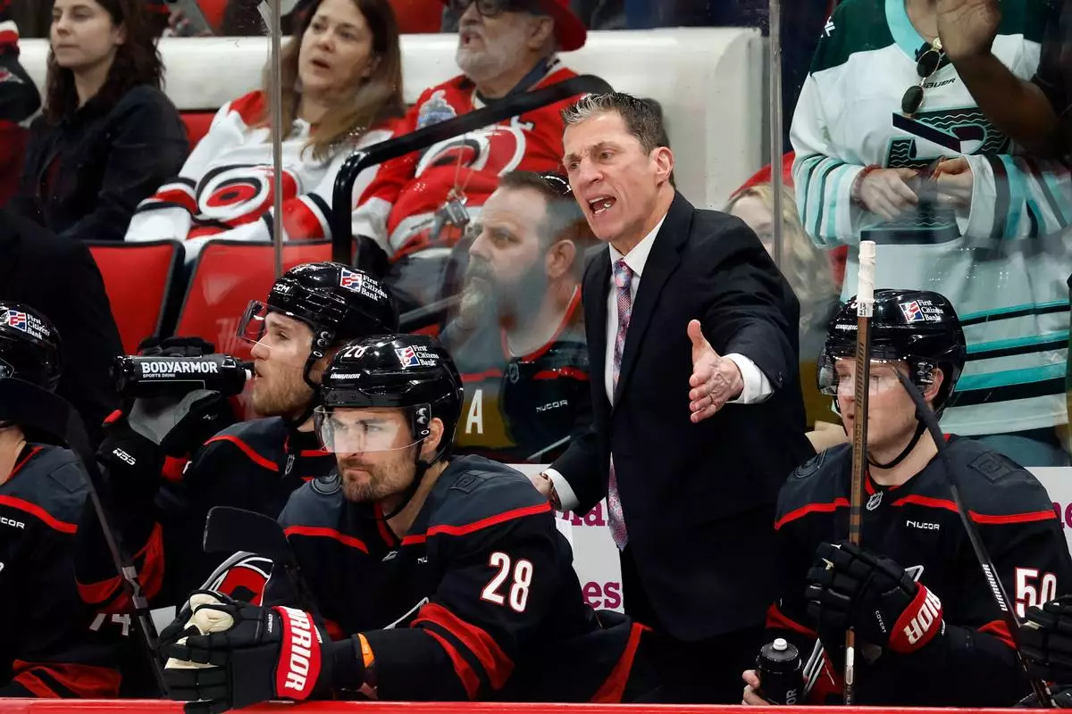 Carolina Hurricanes' Rod Brind'Amour, center, protests a call with officials during the second period of an NHL hockey game against the New York Islanders in Raleigh, N.C., Saturday, April 4, 2026. (AP Photo/Karl DeBlaker)