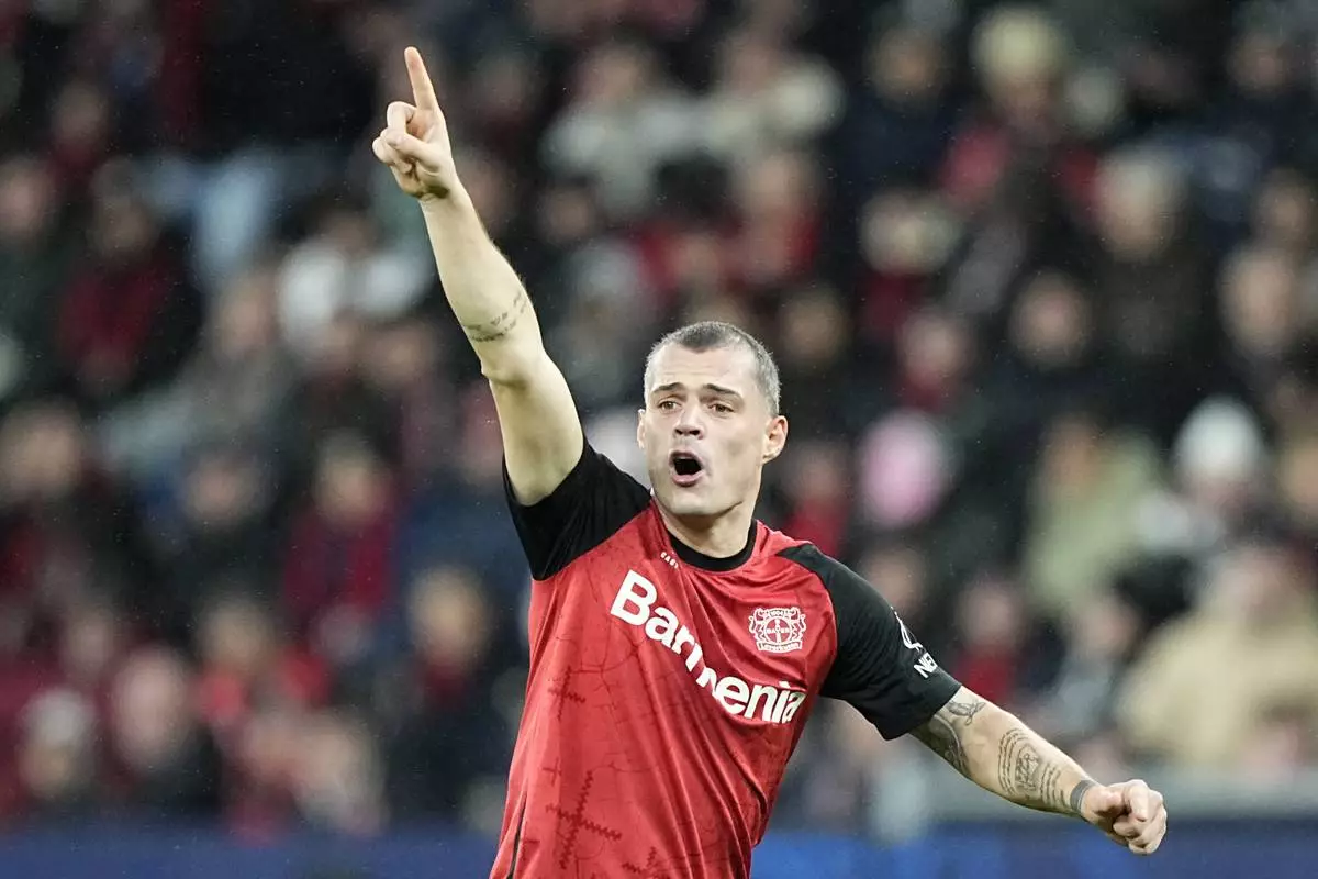 FILE - Leverkusen's Granit Xhaka gestures during the Champions League opening phase soccer match between Bayer Leverkusen and Sparta Prague at the BayArena in Leverkusen, Germany, Wednesday, Jan. 29, 2025. (AP Photo/Martin Meissner, File)