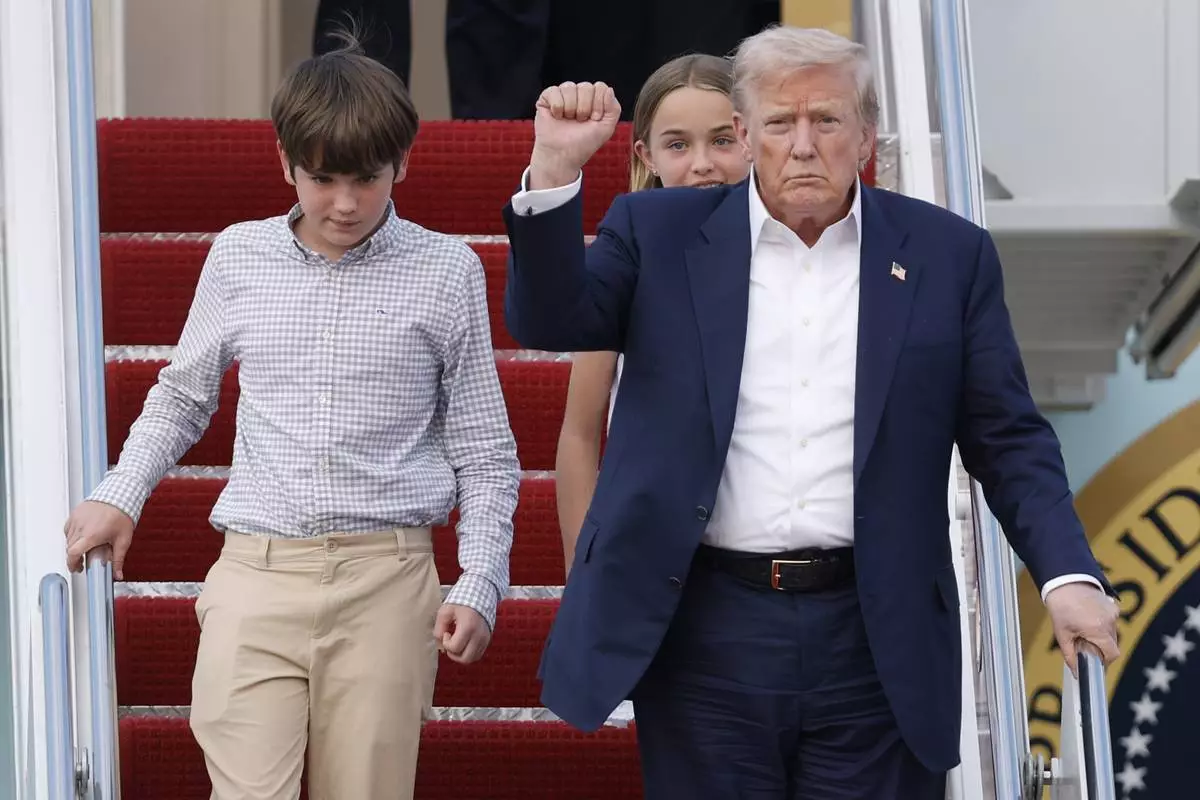 President Donald Trump, front right, gestures as he walks down the stairs of Air Force One with his grandchildren, Spencer, left, and Chloe, back center, upon his arrival at Joint Base Andrews, Md., Tuesday, July 29, 2025. (AP Photo/Luis M. Alvarez)
