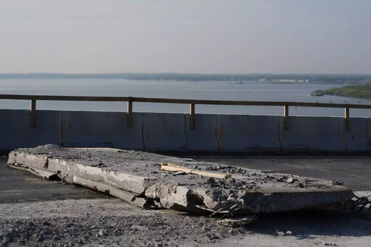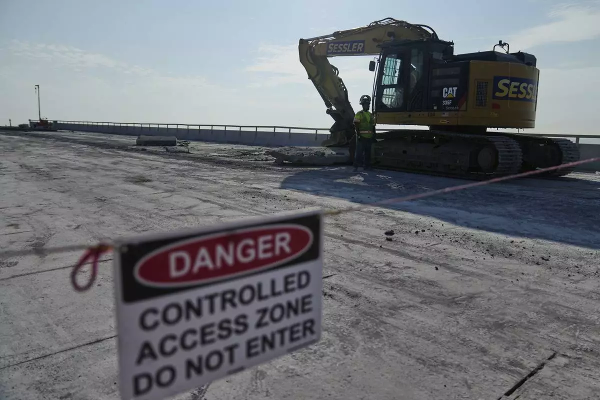 Crews working to remove its skeletal remains are cutting the concrete deck into 6-foot (1.83-meter) sections and carting them away to be recycled during the construction process, said Brian Wolfe, director of project development for the Maryland Transportation Authority. He said this phase of the demolition should take about nine months.