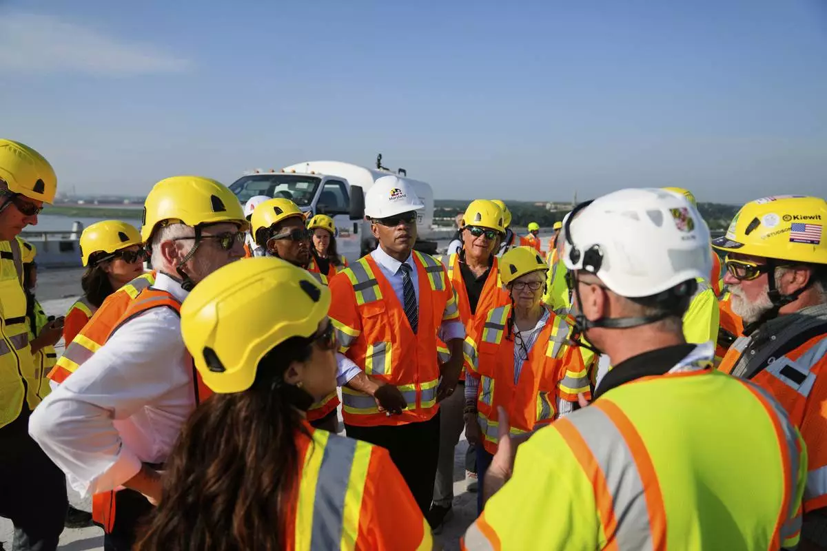 From center left, Sen. Chris Van Hollen, D-Md., Baltimore Mayor Brandon Scott and Maryland Gov. Wes Moore speak with representatives of the Maryland Transportation Authority during a tour of the demolition work zone for the remaining portions of the Francis Scott Key Bridge, Wednesday, July 30, 2025, in Baltimore. (AP Photo/Stephanie Scarbrough)