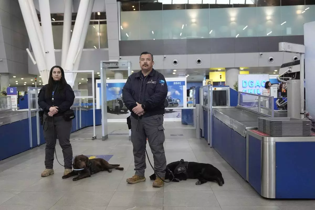 Chilean security agents stand with their sniffer dogs during a a security demonstration related to TSA screening and a Biometric Identification Transnational Migration Alert Program (BITMAP) at the Arturo Merino BenÌtez International Airport, Wednesday, July 30, 2025, in Santiago, Chile, before the departure of U.S. Homeland Security Secretary Kristi Noem. (AP Photo/Alex Brandon, Pool)