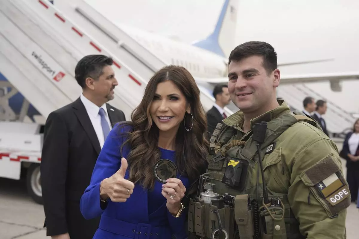 U.S. Homeland Security Secretary Kristi Noem poses for photos with a member of the Chilean special operations police (GOPE) as she departs Arturo Merino Benitez International Airport in Santiago, Chile, Wednesday, July 30, 2025. (AP Photo/Alex Brandon, Pool)
