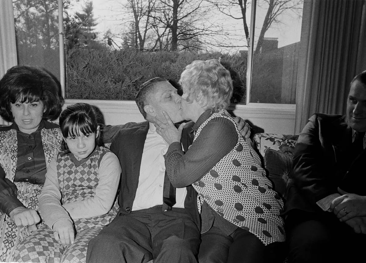 FILE - Former Teamsters Union leader Jimmy Hoffa receives a Christmas kiss from his wife Josephine at his daughter's suburban St. Louis home, Dec. 24, 1971. (AP Photo/Fred Waters, file)