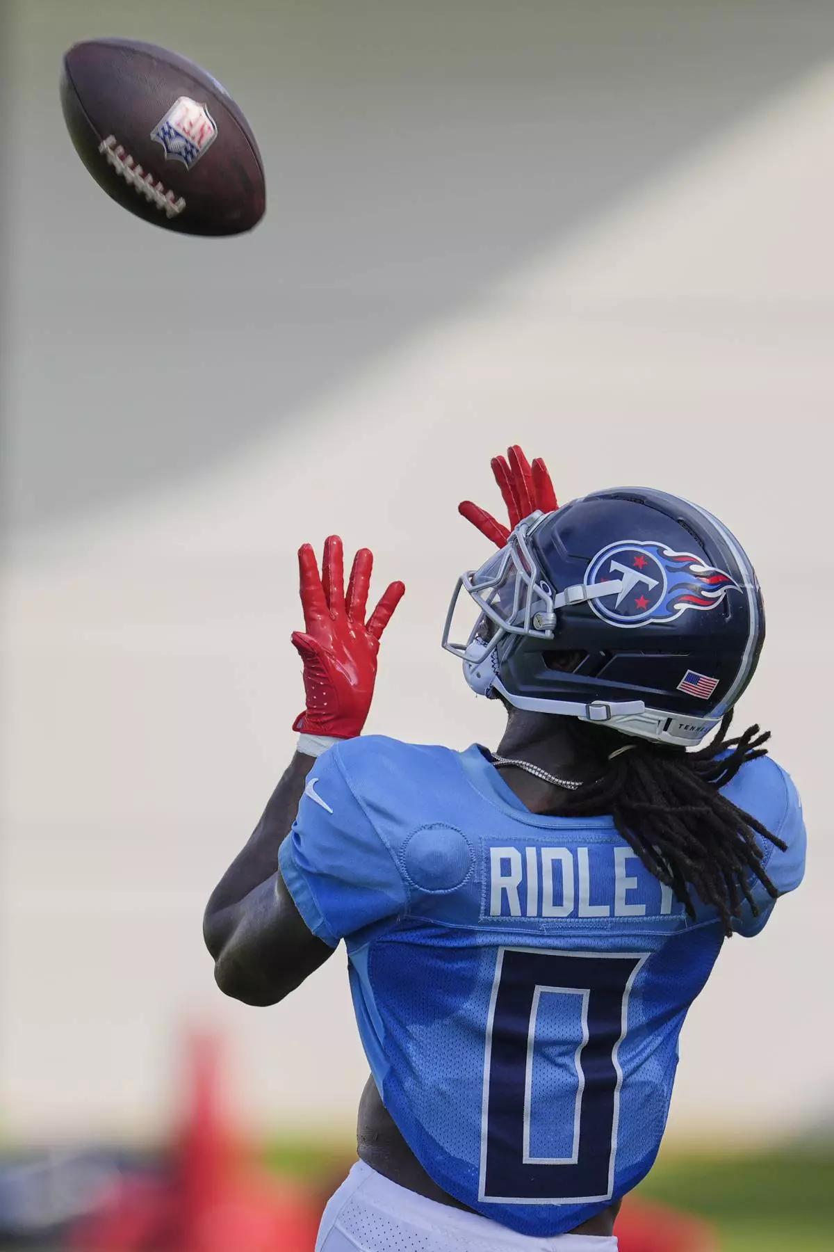 Tennessee Titans wide receiver Calvin Ridley (0) makes a catch during practice at the team's NFL football training camp Wednesday, July 30, 2025, in Nashville, Tenn. (AP Photo/George Walker IV)