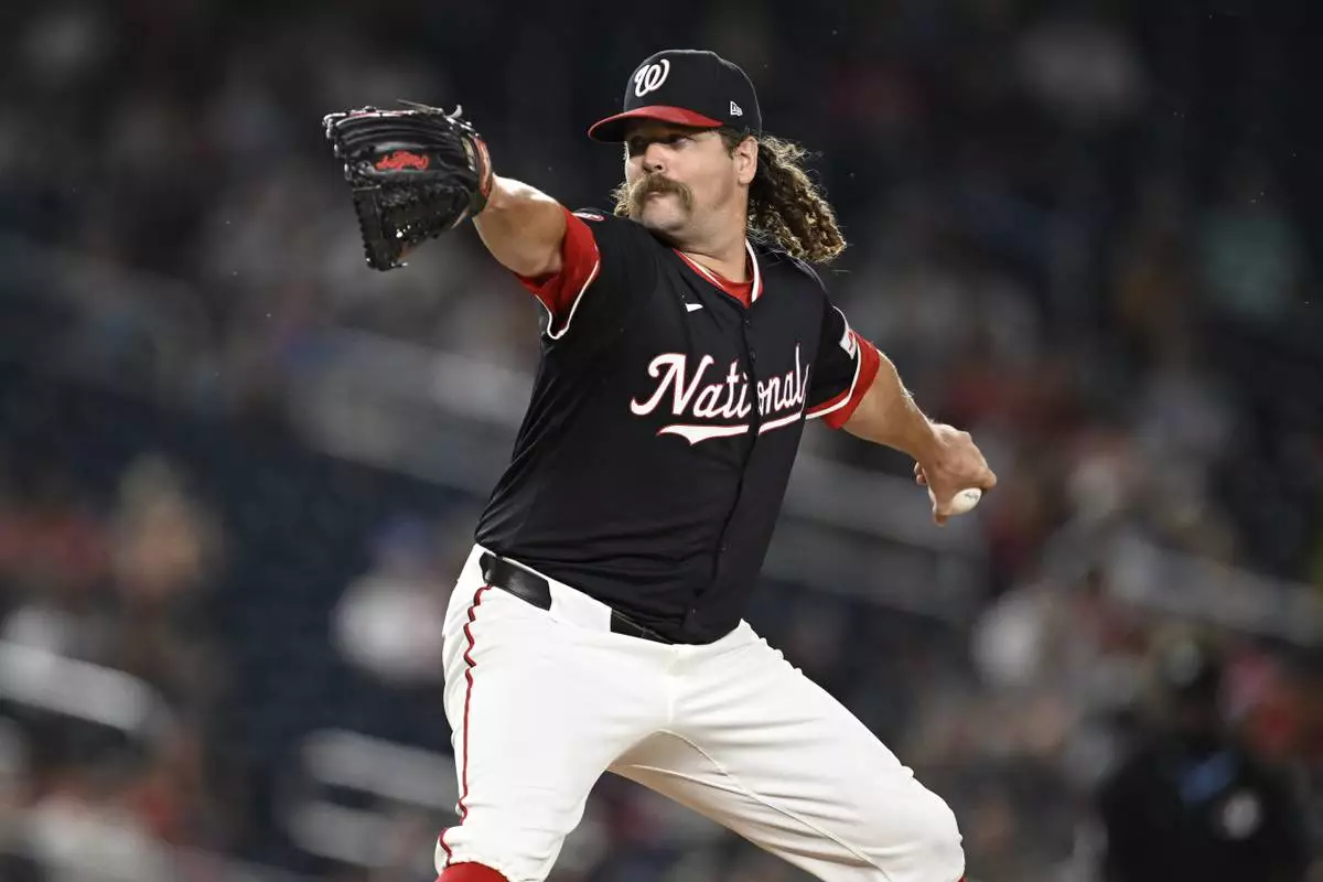 Washington Nationals pitcher Andrew Chafin throws during the sixth inning of a baseball game against the Cincinnati Reds in Washington, Monday, July 21, 2025. (AP Photo/Terrance Williams)