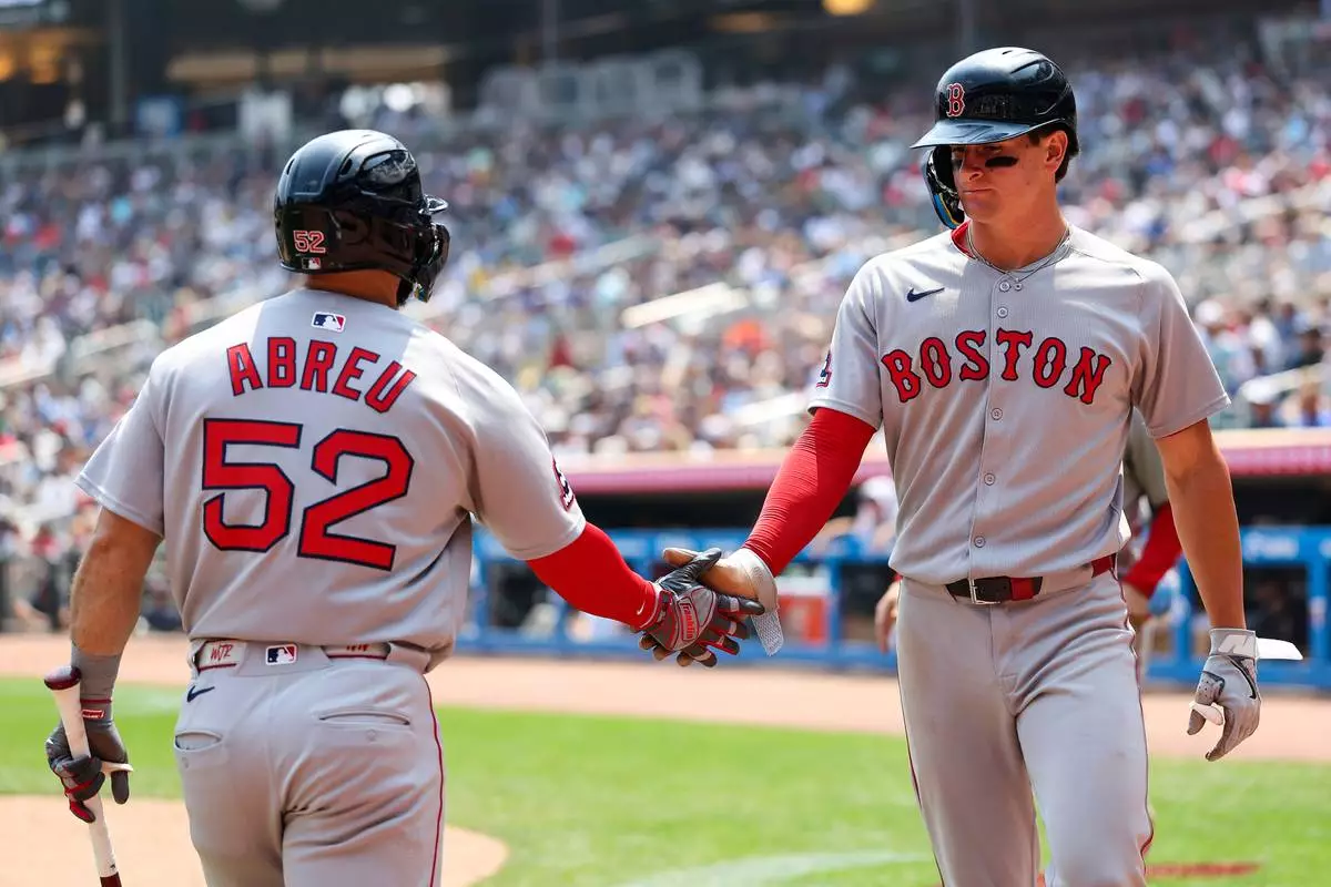 Boston Red Sox's Roman Anthony, right, celebrates with Wilyer Abreu after scoring on a single hit by Jarren Duran during the fifth inning of baseball game against the Minnesota Twins, Wednesday, July 30, 2025, in Minneapolis. (AP Photo/Matt Krohn)