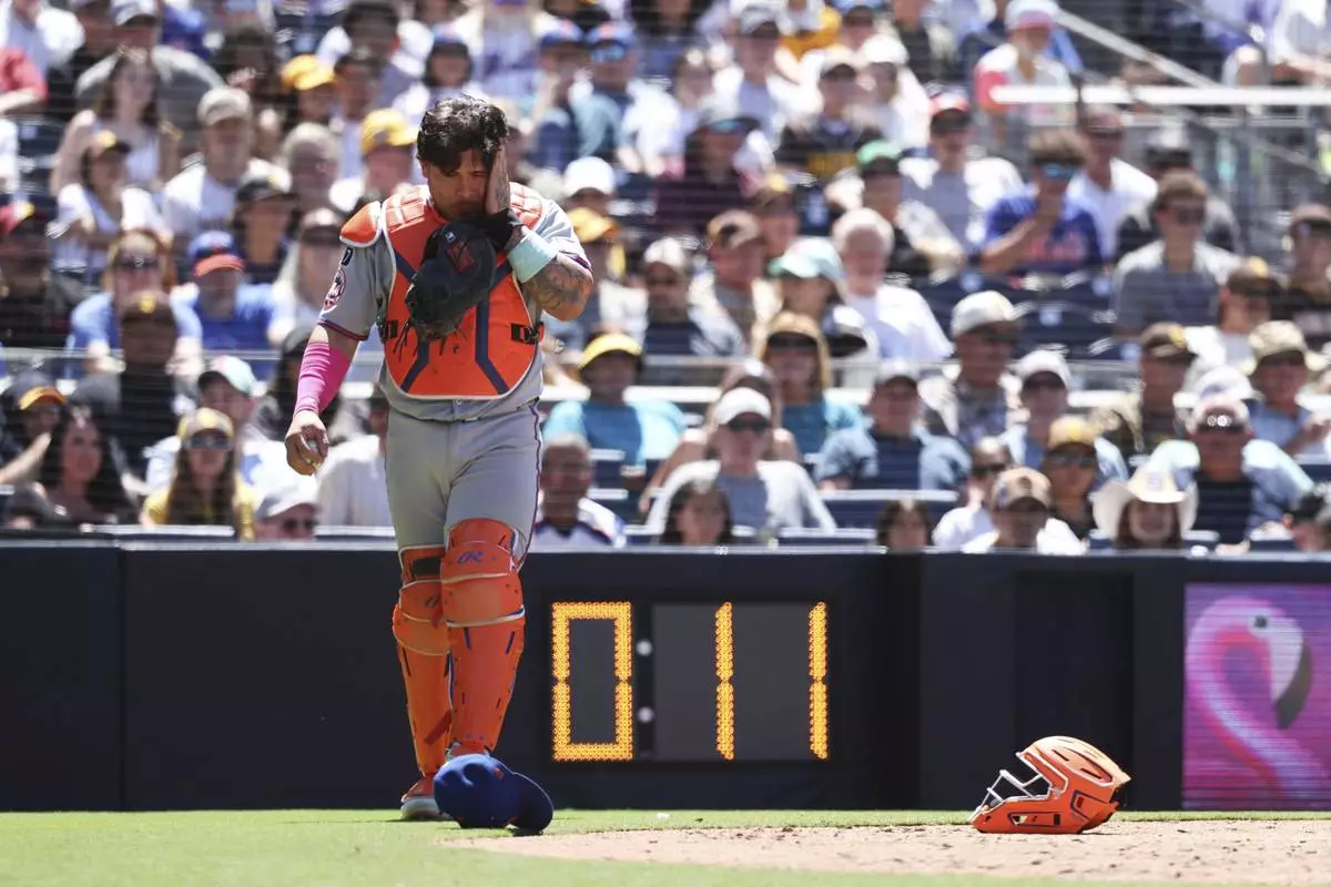 New York Mets catcher Francisco Alvarez reacts after taking a foul ball off his mask hit by San Diego Padres' Martin Maldonado in the fifth inning of a baseball game Wednesday, July 30, 2025, in San Diego. (AP Photo/Derrick Tuskan)