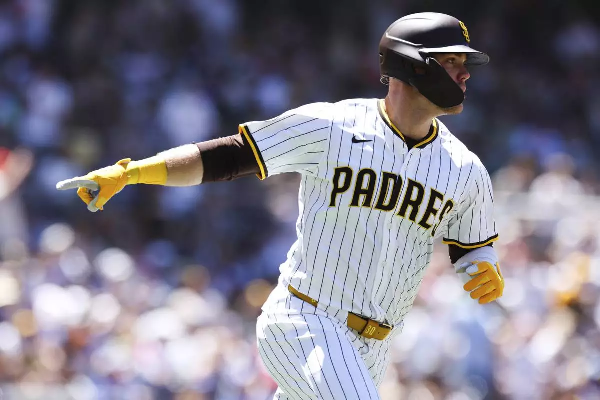 San Diego Padres' Gavin Sheets points towards his dugout after hitting a two-run home run against the New York Mets in the third inning of a baseball game Wednesday, July 30, 2025, in San Diego. (AP Photo/Derrick Tuskan)