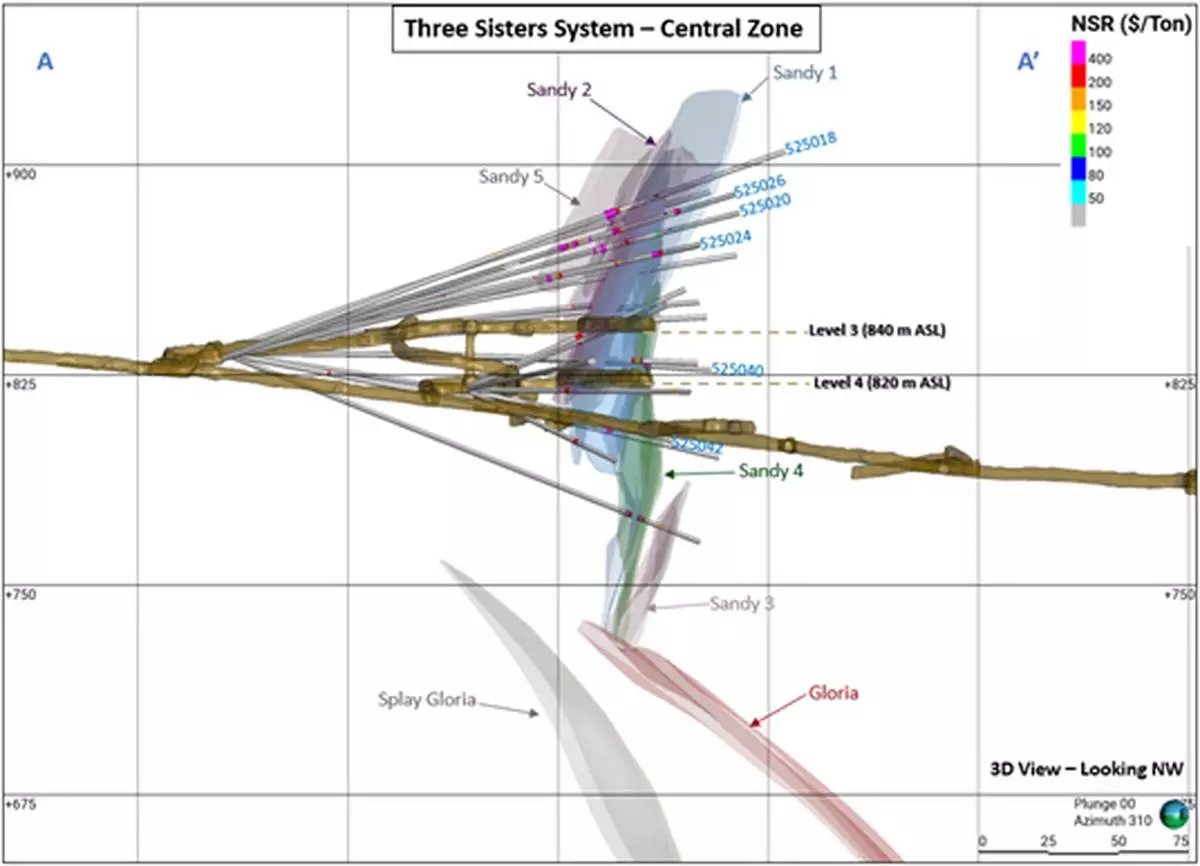 The Three Sisters and Gloria vein systems remain open to the northwest, up-dip and at depth, and their close spatial and structural association continues to support their interpretation as a unified mineralized corridor. Additional exploration development planned for Q3 will allow for continued expansion and infill drilling to the north-west of the current resource shell limits.