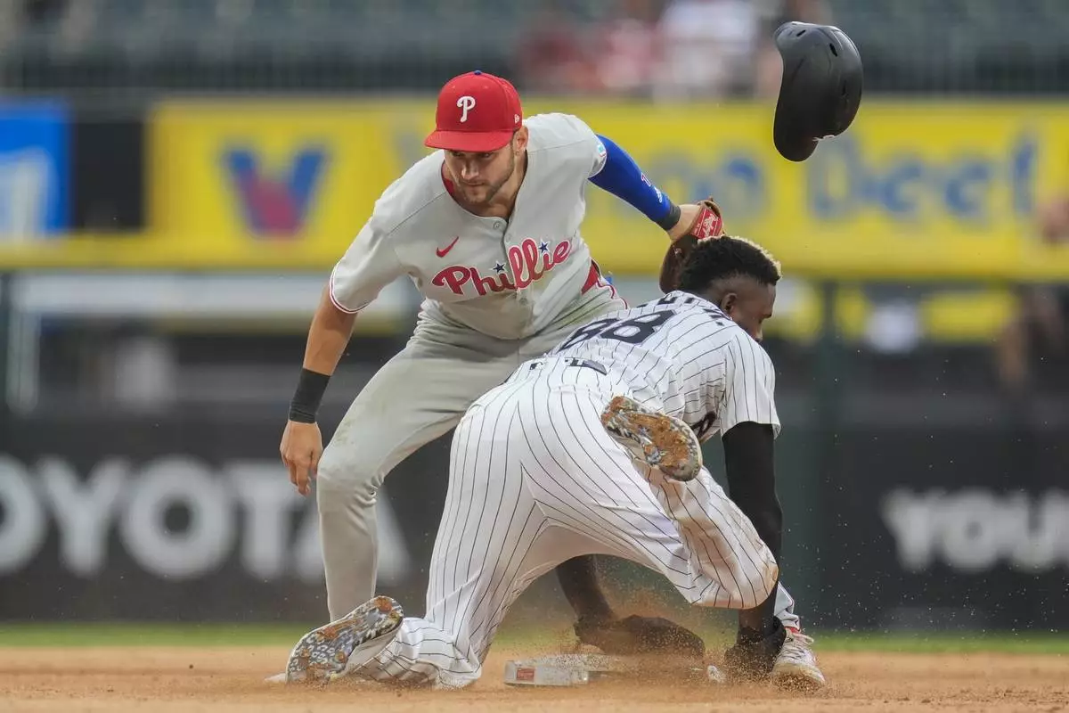 Philadelphia Phillies shortstop Trea Turner (7), left, can't catch Chicago White Sox's Luis Robert Jr. (88) as he steals second during the sixth inning of a baseball game Wednesday, July 30, 2025, in Chicago. (AP Photo/Erin Hooley)