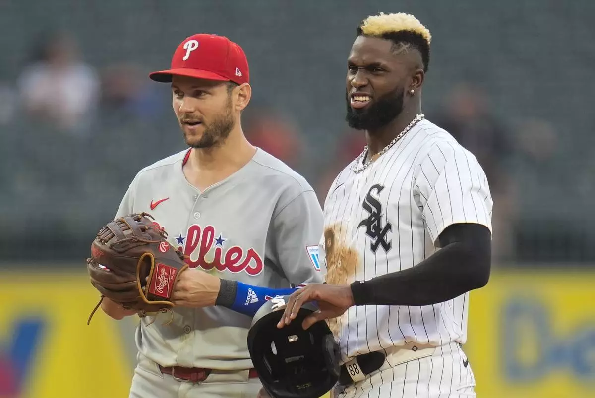 Philadelphia Phillies shortstop Trea Turner (7), left, stands next to White Sox's Luis Robert Jr. (88) as a tag-out play is reviewed during the sixth inning of a baseball game Wednesday, July 30, 2025, in Chicago. (AP Photo/Erin Hooley)