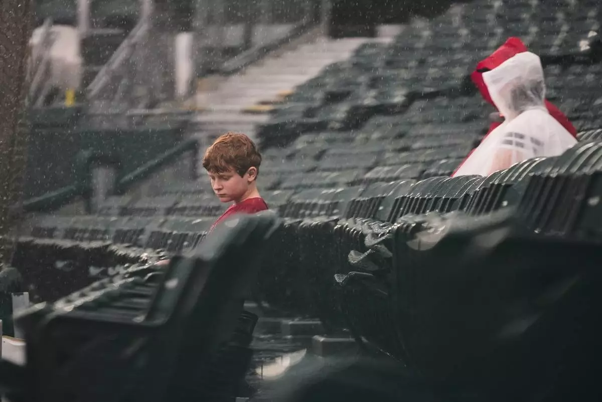 Fans wait out a rain delay before a baseball game between the Philadelphia Phillies and Chicago White Sox, Wednesday, July 30, 2025, in Chicago. (AP Photo/Erin Hooley)