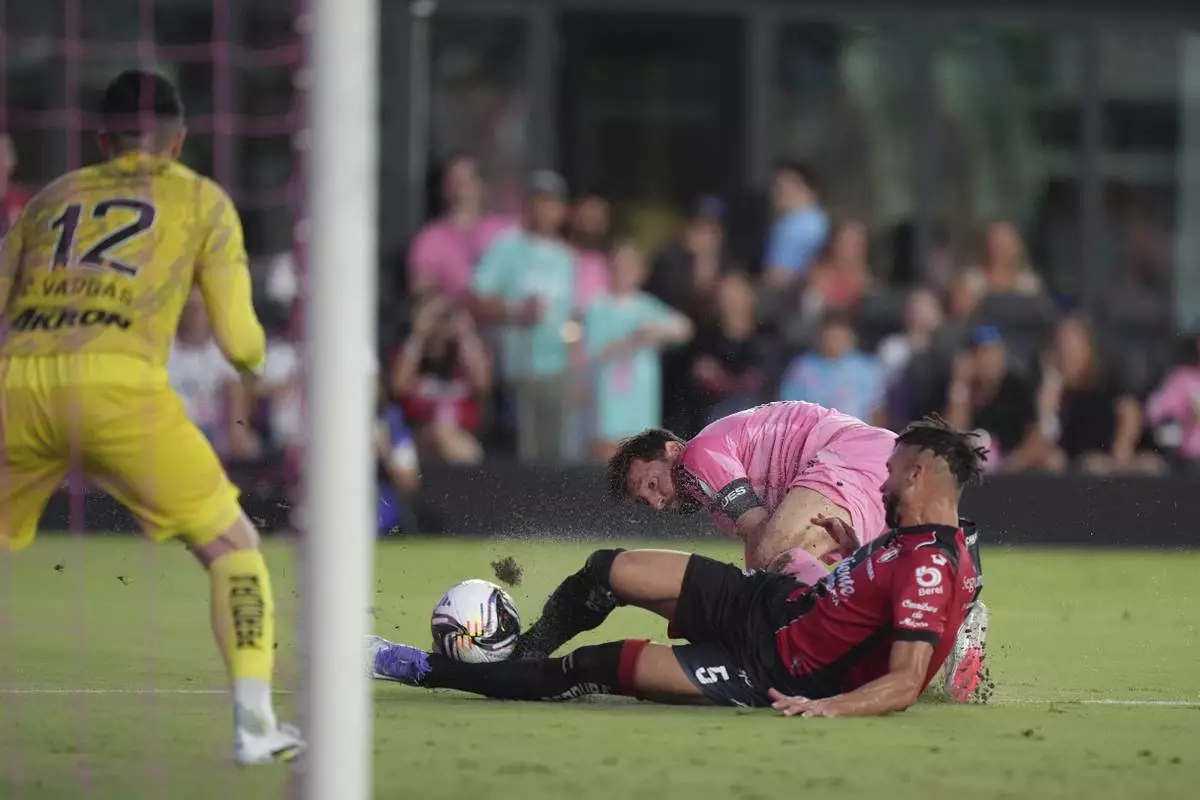 Inter Miami forward Lionel Messi, back, attempts to score past Atlas defender Doria (5) and goalkeeper Camilo Vargas (12) during the first half of a Leagues Cup group stage soccer match, Wednesday, July 30, 2025, in Fort Lauderdale, Fla. (AP Photo/Rebecca Blackwell)