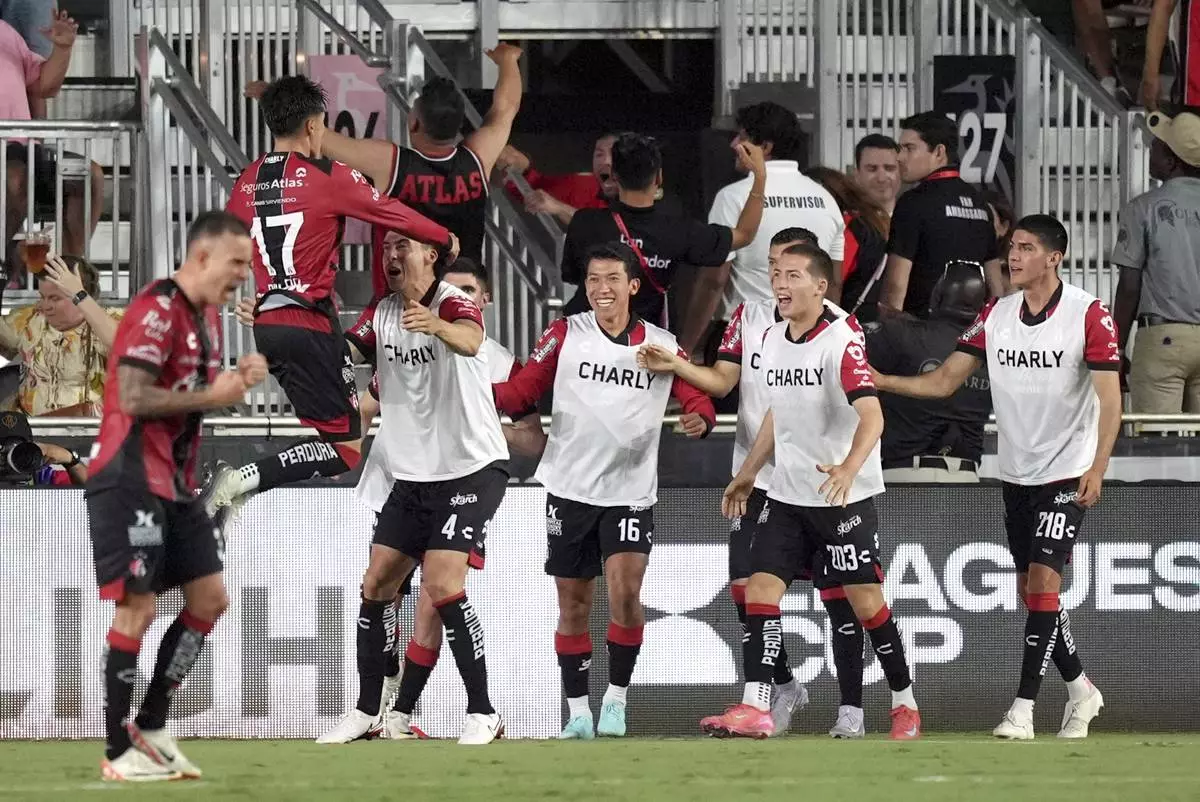 Atlas defender Jose Lozano (17) celebrates with substitutes warming up on the sideline after scoring his side's first goal against Inter Miami, during the second half of a Leagues Cup group stage soccer match, Wednesday, July 30, 2025, in Fort Lauderdale, Fla. (AP Photo/Rebecca Blackwell)
