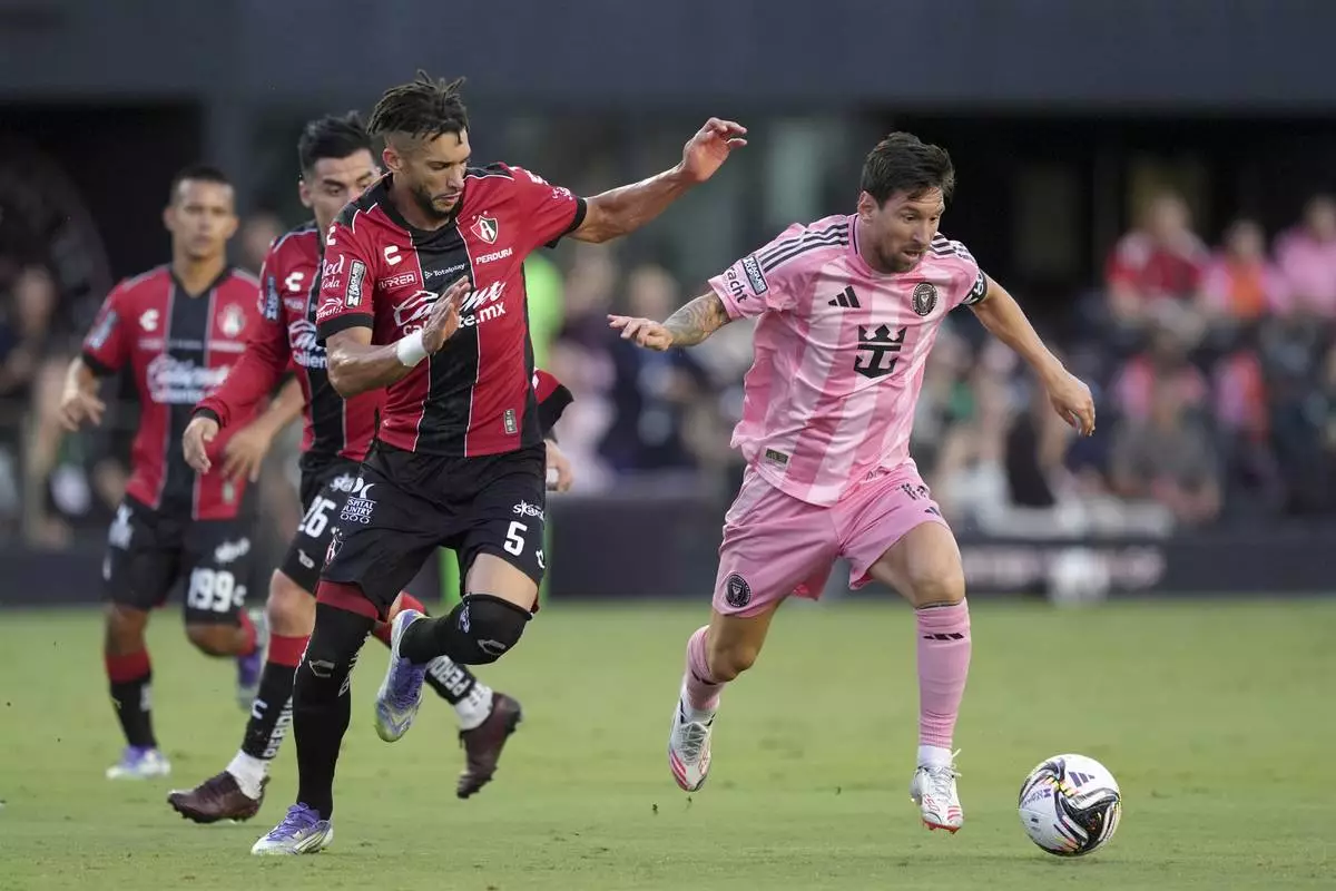 Inter Miami forward Lionel Messi, right, is pursued by Atlas defender Doria (5) during the first half of a Leagues Cup group stage soccer match, Wednesday, July 30, 2025, in Fort Lauderdale, Fla. (AP Photo/Rebecca Blackwell)