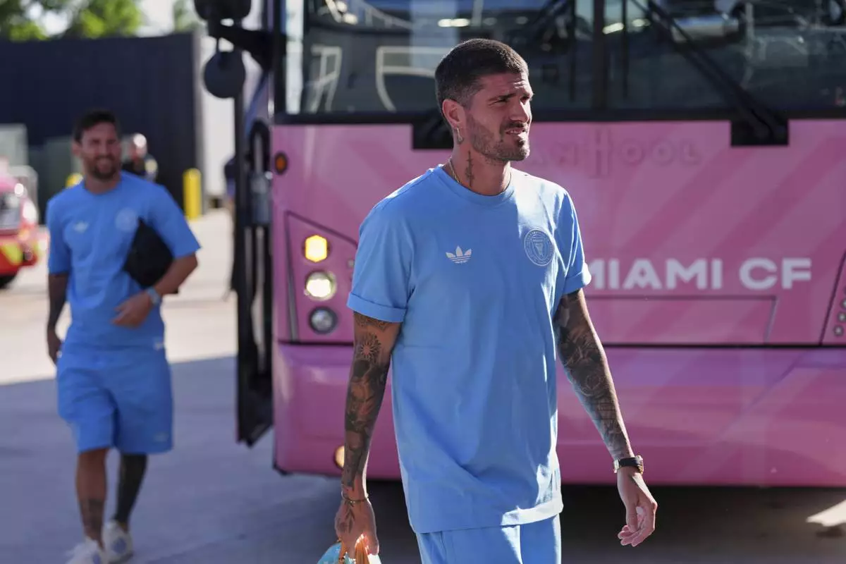 Inter Miami midfielder Rodrigo De Paul, right, and forward Lionel Messi arrive ahead of a Leagues Cup group stage soccer match against Atlas, Wednesday, July 30, 2025, in Fort Lauderdale, Fla. (AP Photo/Rebecca Blackwell)