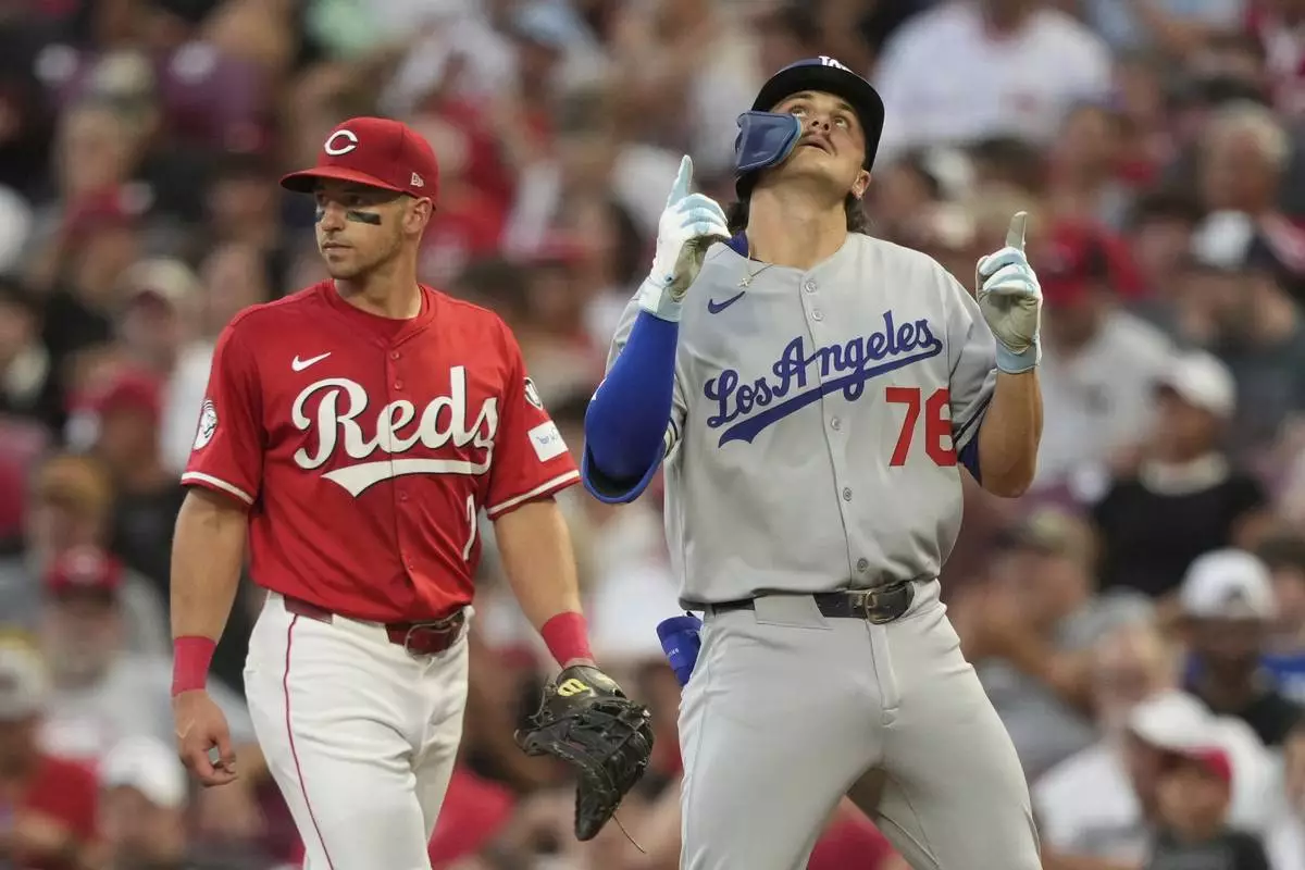 Los Angeles Dodgers' Alex Freeland reacts after hittting his first major league hit during the fifth inning of a baseball game against the Cincinnati Reds Wednesday, July 30, 2025, in Cincinnati. (AP Photo/Carolyn Kaster)
