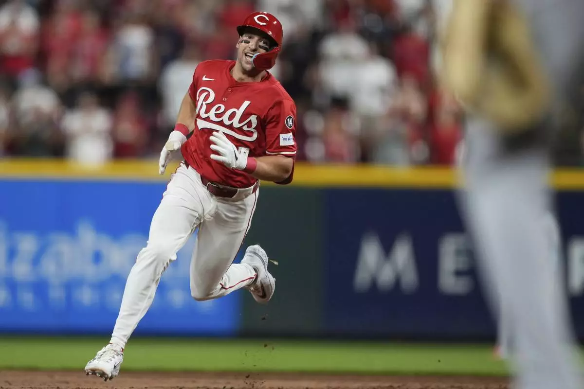 Cincinnati Reds' Spencer Steer hits a two-run scring triple during the eighth inning of a baseball game against the Los Angeles Dodgers Wednesday, July 30, 2025, in Cincinnati. (AP Photo/Carolyn Kaster)