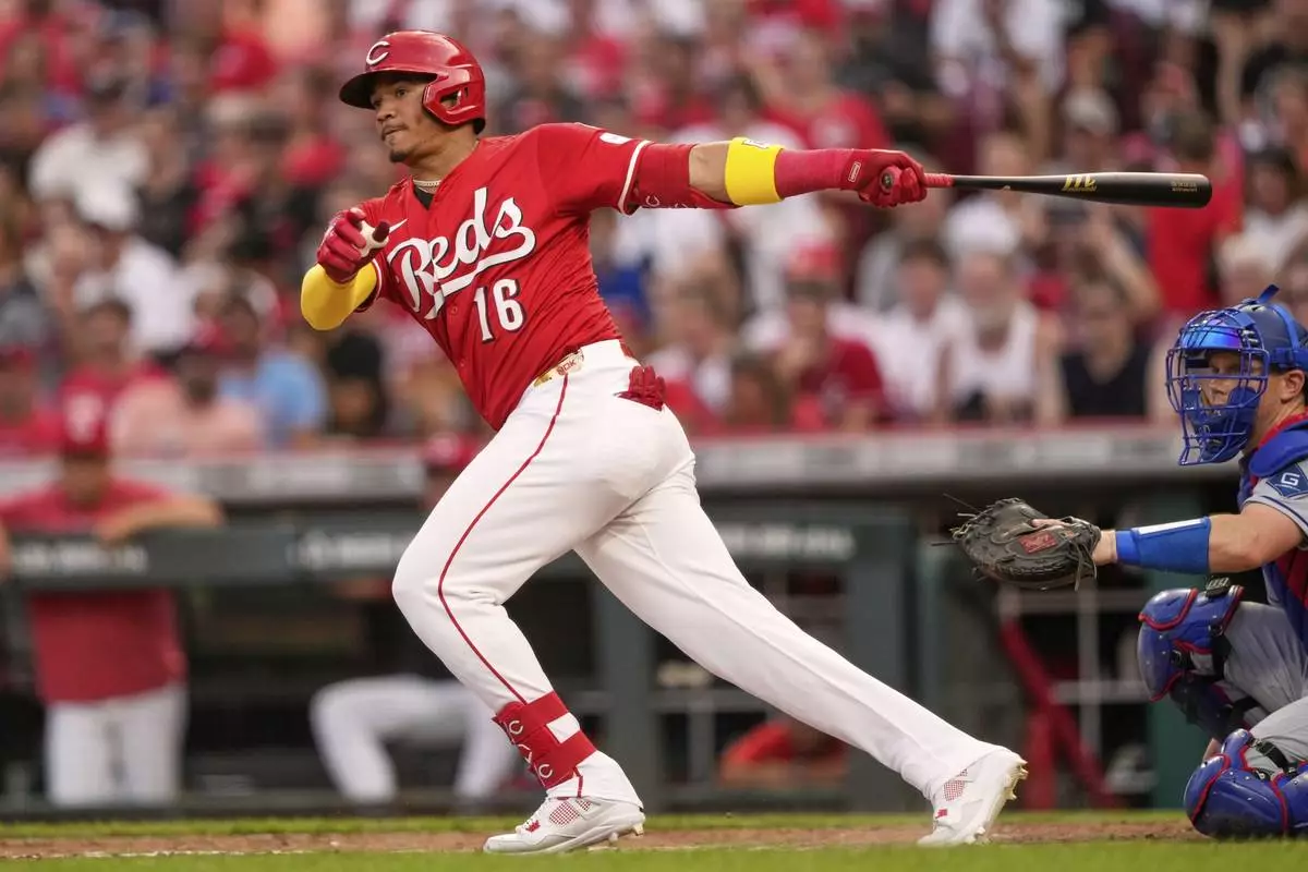 Cincinnati Reds' Noelvi Marte hits a single during the fourth inning of a baseball game against the Los Angeles Dodgers Wednesday, July 30, 2025, in Cincinnati. (AP Photo/Carolyn Kaster)