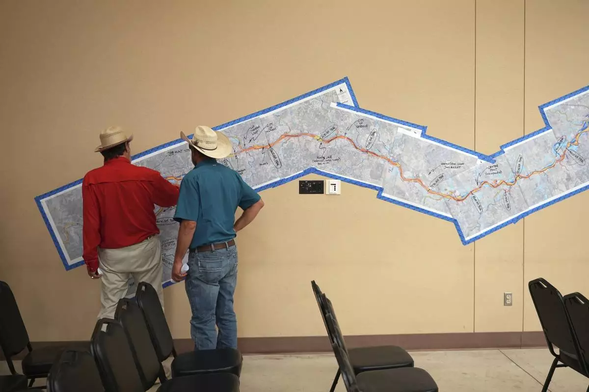 Attendees look at a marked up map of the Guadalupe River during a Senate and House Select Committees on Disaster Preparedness and Flooding public hearing, in Kerrville, Texas, Thursday, July 31, 2025. (AP Photo/Eric Gay)