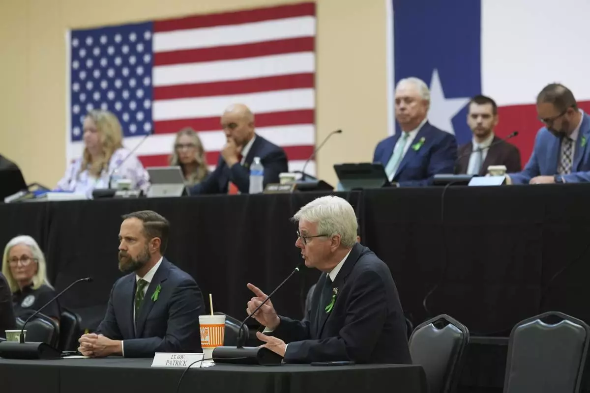 Texas Lt. Gov. Dan Patrick, center, speaks during a Senate and House Select Committees on Disaster Preparedness and Flooding public hearing in Kerrville, Texas, Thursday, July 31, 2025. (AP Photo/Eric Gay)
