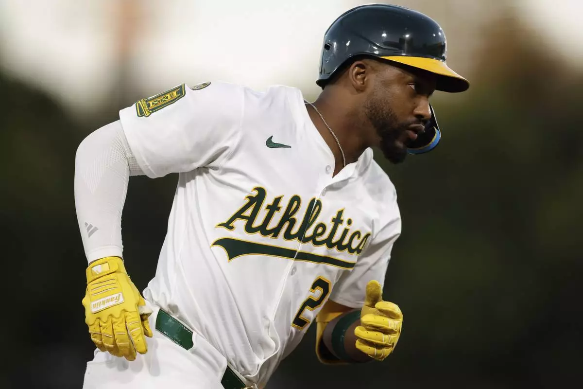 Athletics' Miguel Andujar rounds the bases after hitting a one run home run during the fourth inning of a baseball game against the Seattle Mariners Wednesday, July 30, 2025, in West Sacramento, Calif. (AP Photo/Sergio Estrada)