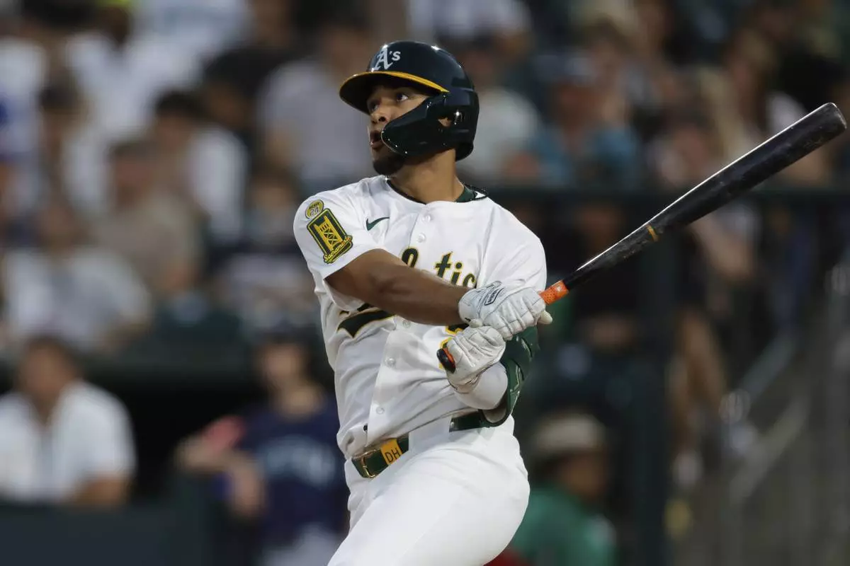 Athletics' Darell Hernaiz hits a one run home run during the fifth inning of a baseball game against the Seattle Mariners Wednesday, July 30, 2025, in West Sacramento, Calif. (AP Photo/Sergio Estrada)
