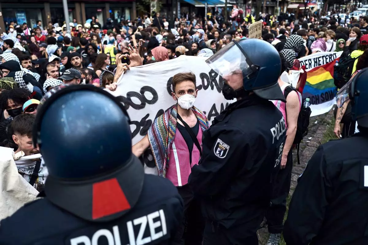 Participants in the Internationalist Queer Pride for Liberation demonstration face police officers in Berlin, on Saturday, July 26, 2025. (Michael Ukas/dpa via AP)